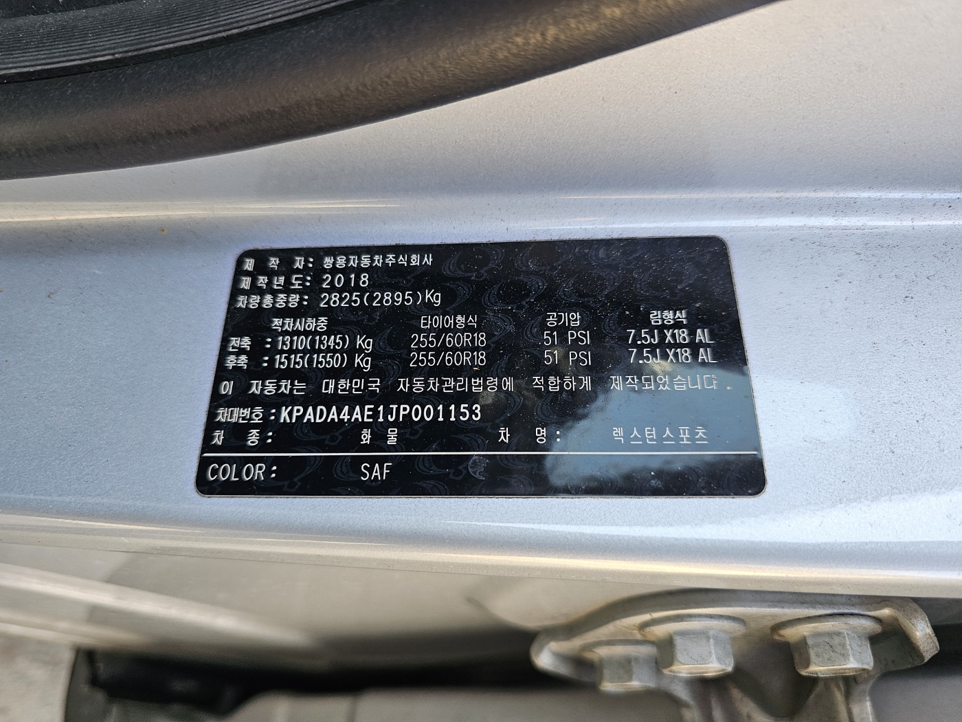 2018 Rexton Sports 4WD Diesel 2.2 Noblesse (S/N: 001153)